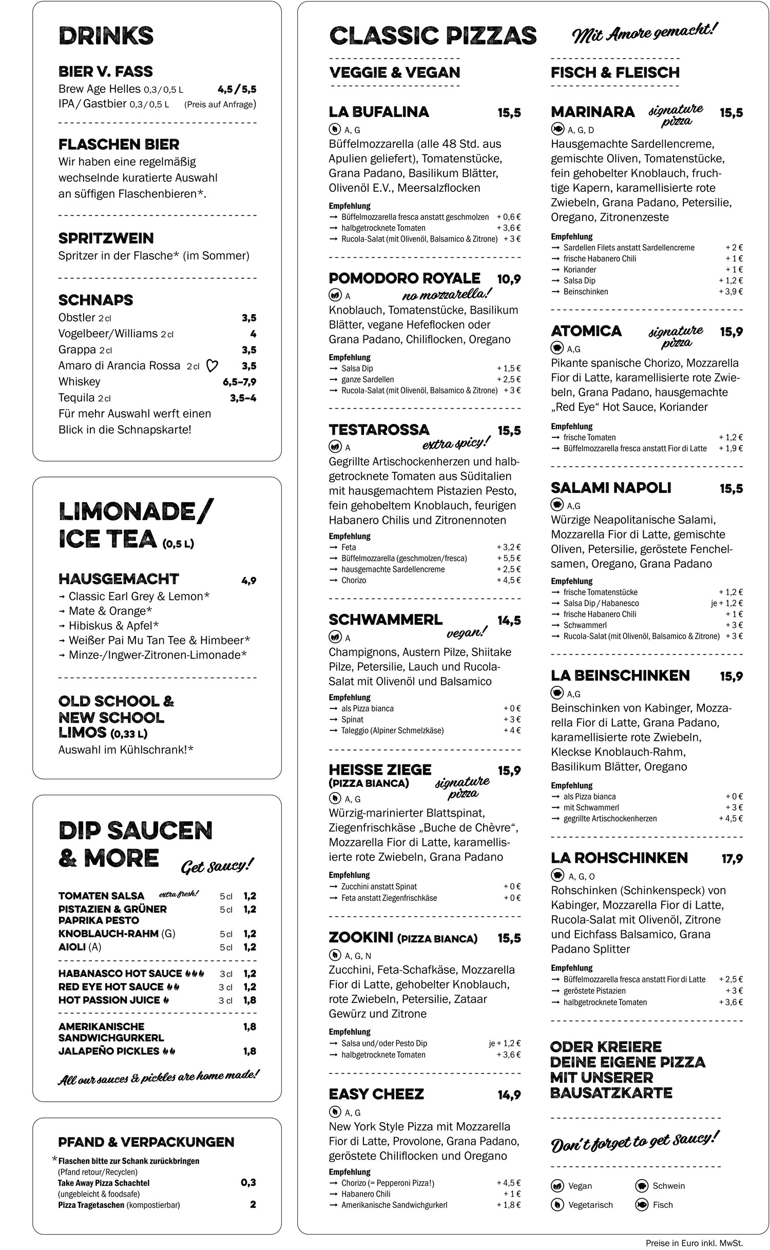 Zum Trinken gibt es Bier-Spezialitäten, hausgemachte Eistees und Limonaden. Der Pizza-Shop ist klein. Der bescheidene Gastraum hat nur wenige Sitz- und Stehplätze an einfachen Holztischen, es entsteht aber eine gute, lockere Atmosphäre.