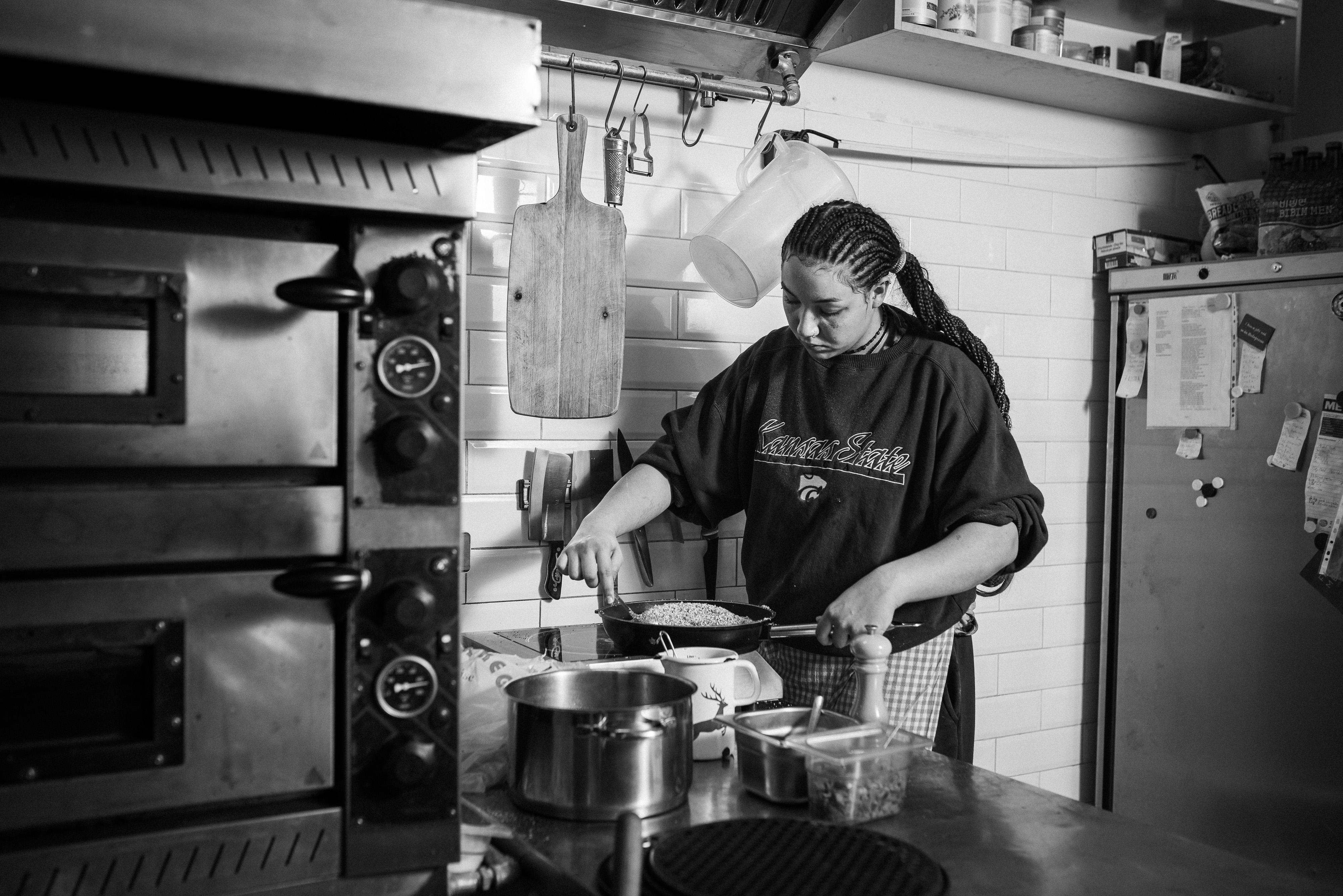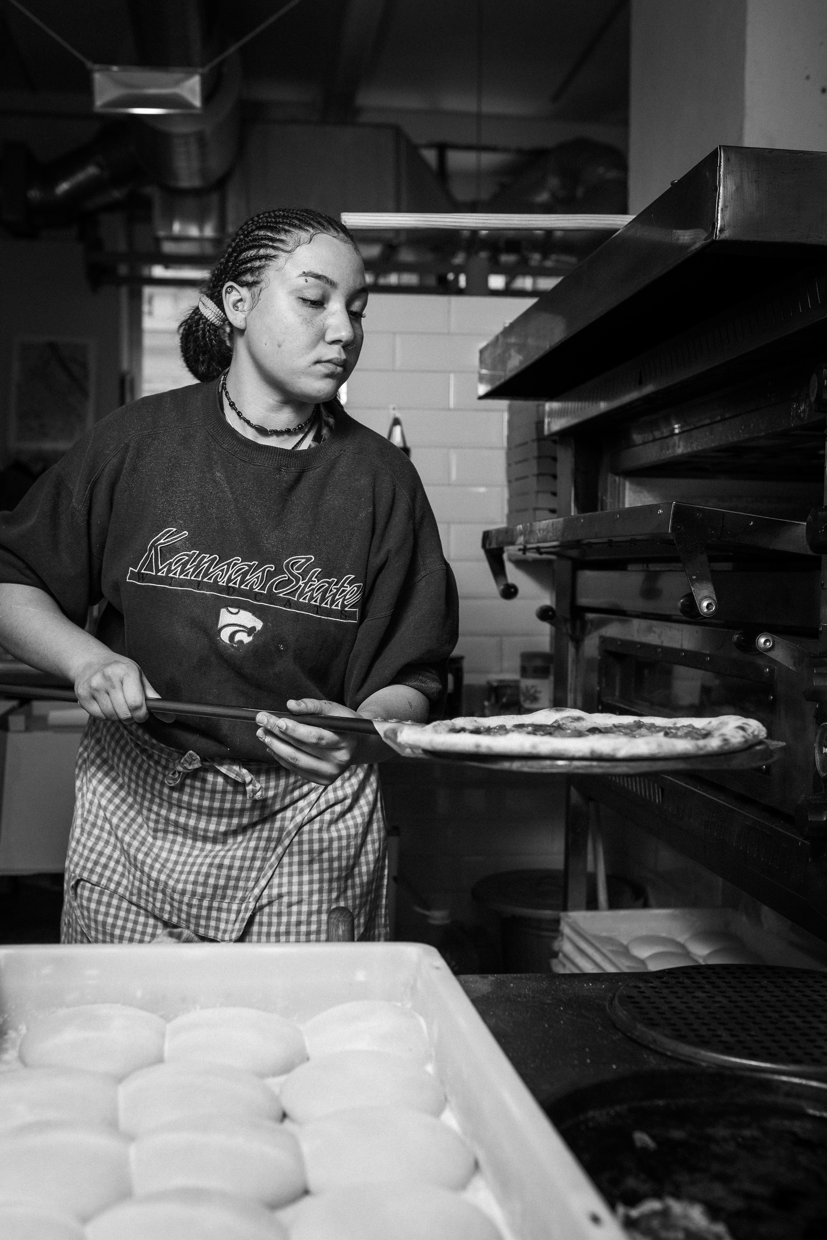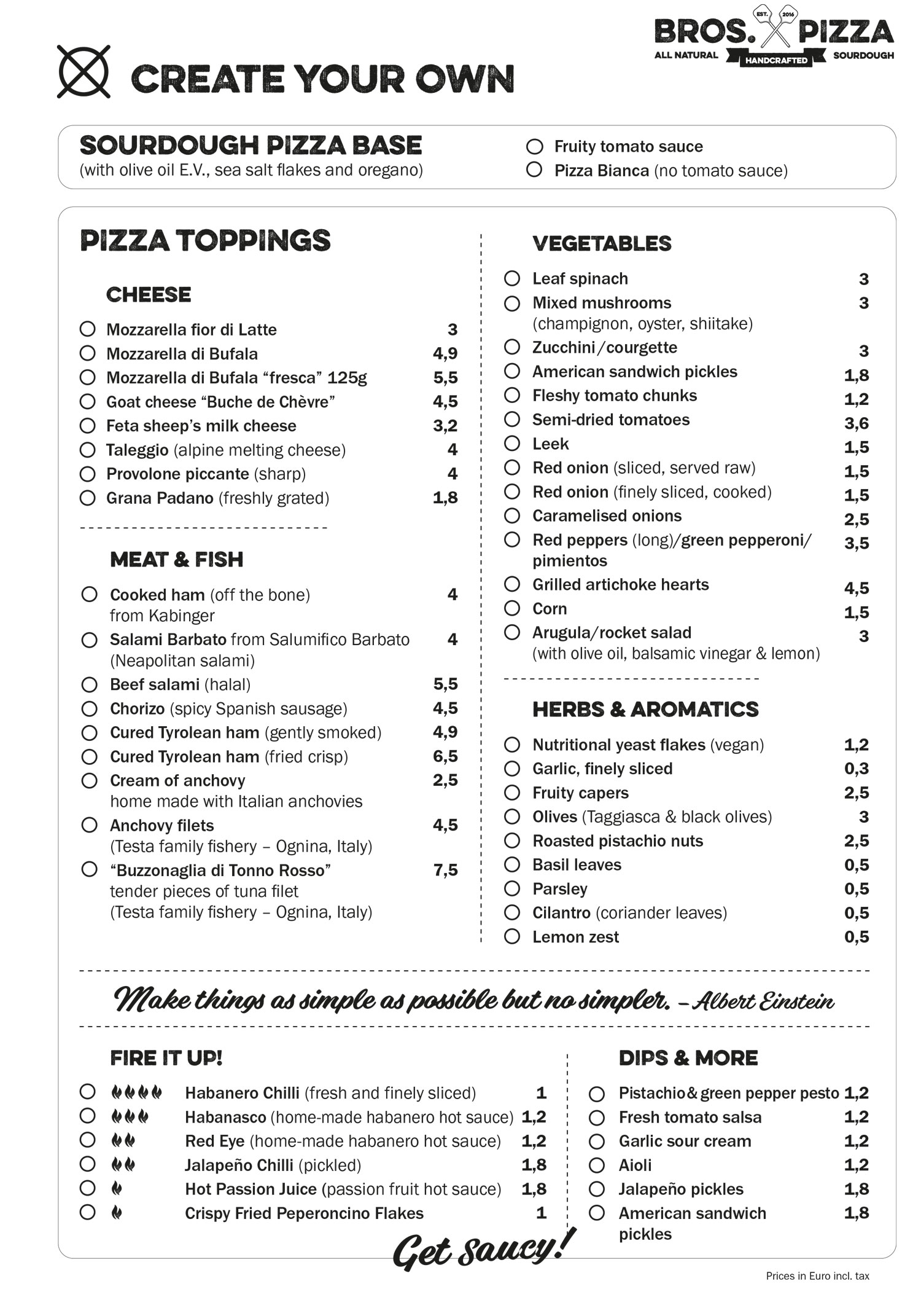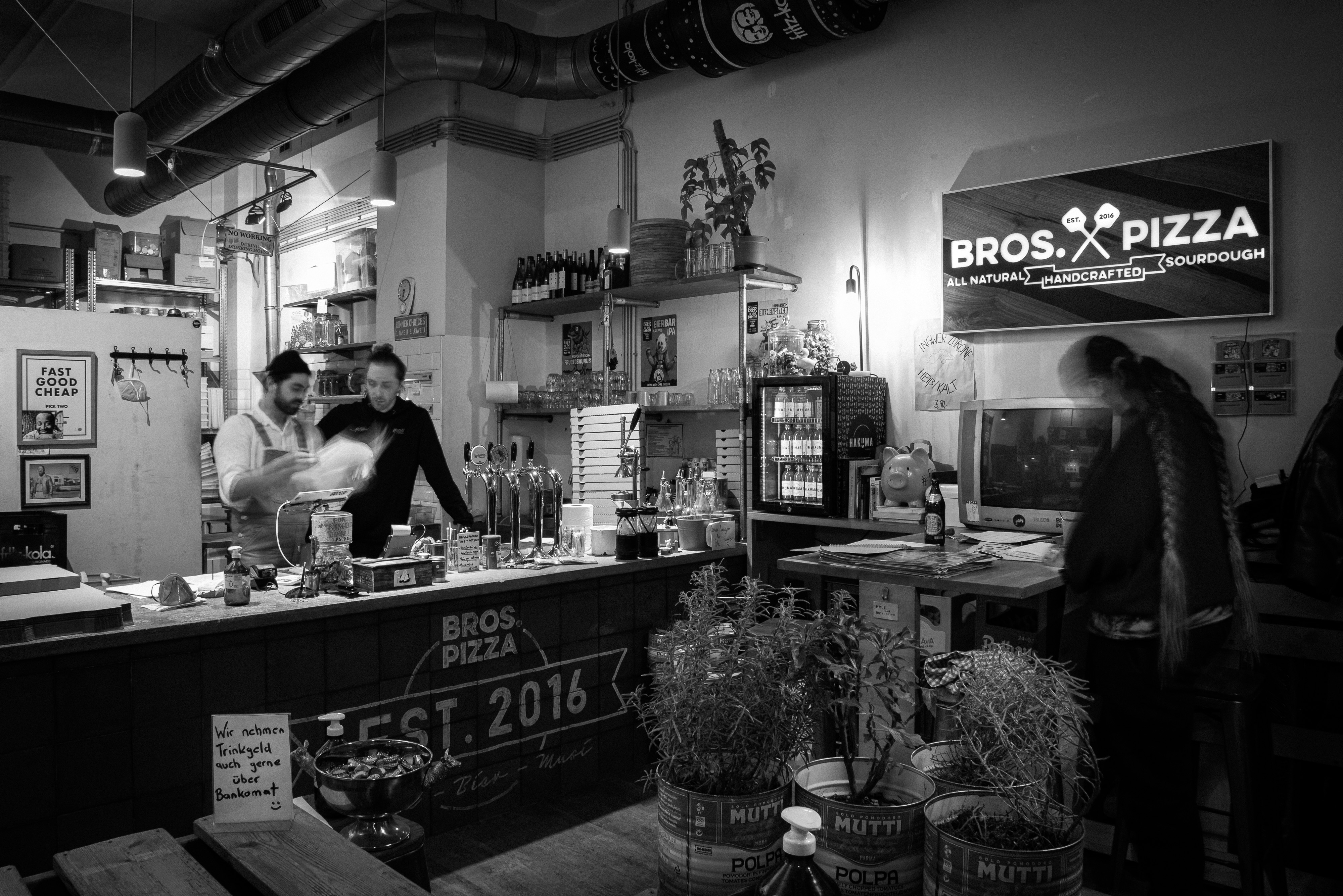 Das Bros Team backt frisch und schnell ganze hauchdünne Pizzen – Zum Trinken gibt‘s Bier-Spezialitäten und hausgemachte Limonaden. Der Pizza-Shop ist klein, der Gastraum hat nur wenige Sitz- und Stehplätze an einfachen Holztischen. Aber es entsteht eine gute, lockere Atmosphäre mit Musik. Wir verrichten unsere Arbeit mit Hingabe und Vergnügen. Hinter der Kachel und Beton Theke findet echtes Handwerk statt und die Marshall-Anlage sorgt für geschmeidigen Sound.