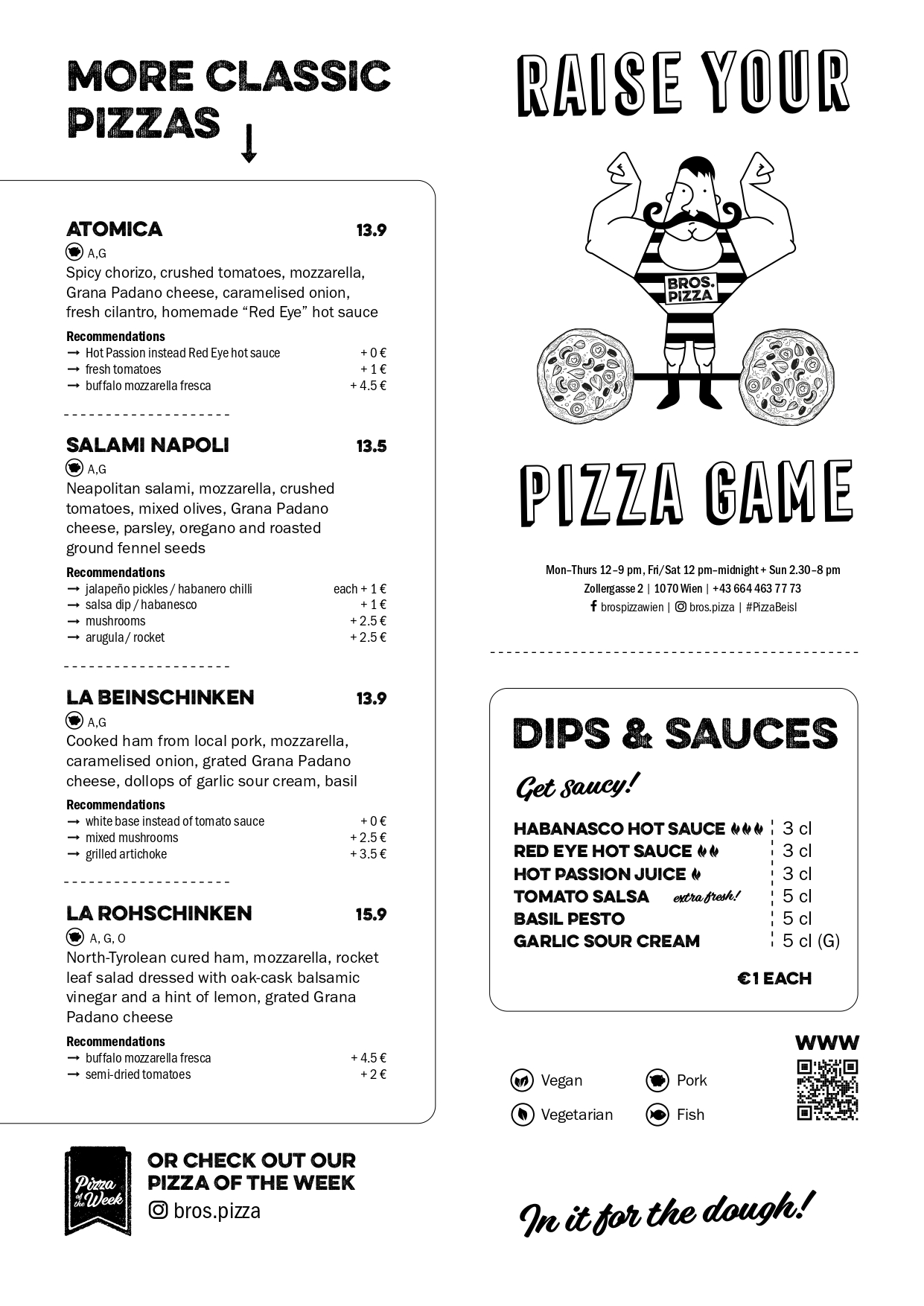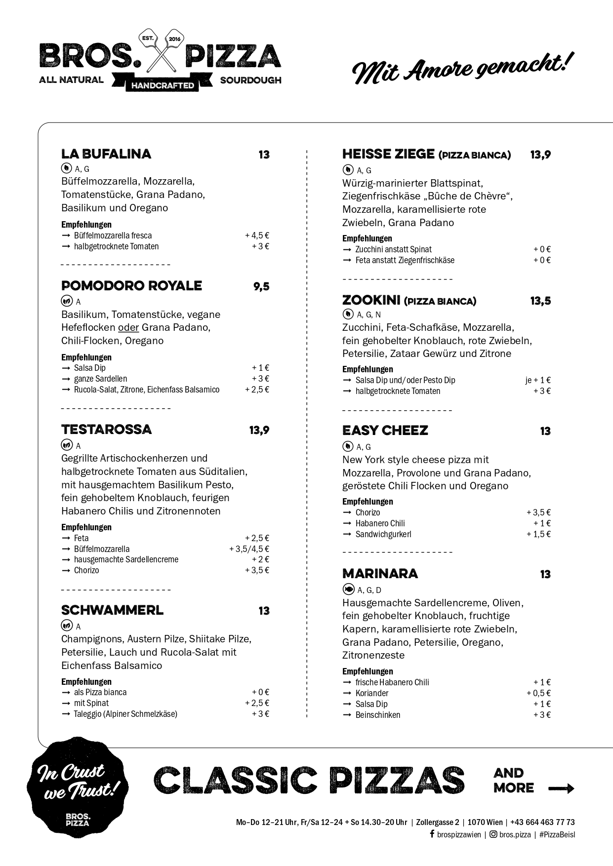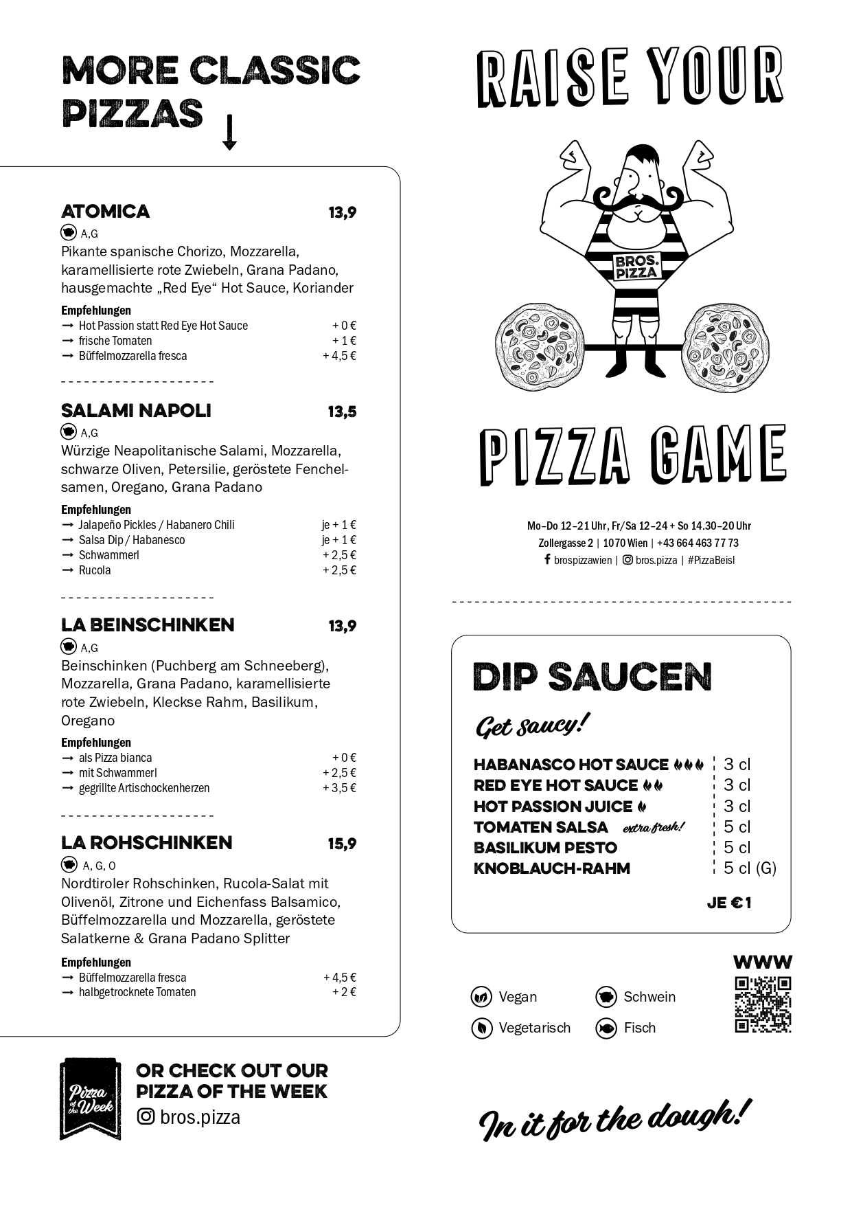 In der Zollergasse, neben der Mariahilfer Straße, bäckt das Bros. Team frisch und schnell hauchdünne Pizzen - zum Mitnehmen oder direkt im Lokal zu genießen.